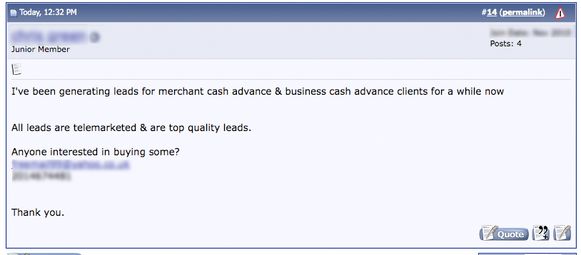 You can find stuff like these in forums, along with a shady hotmail address, no website and a promise of ‘top quality.’ If your business model is to buy leads, then make sure to have your Ch. 11 papers handy before you purchase these TOP QUALITY LEADS!!!