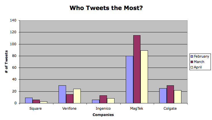 We compared Square’s tweets to three POS hardware companies, Verifone, Ingenico, and Magtek. We threw in Colgate for good measure.