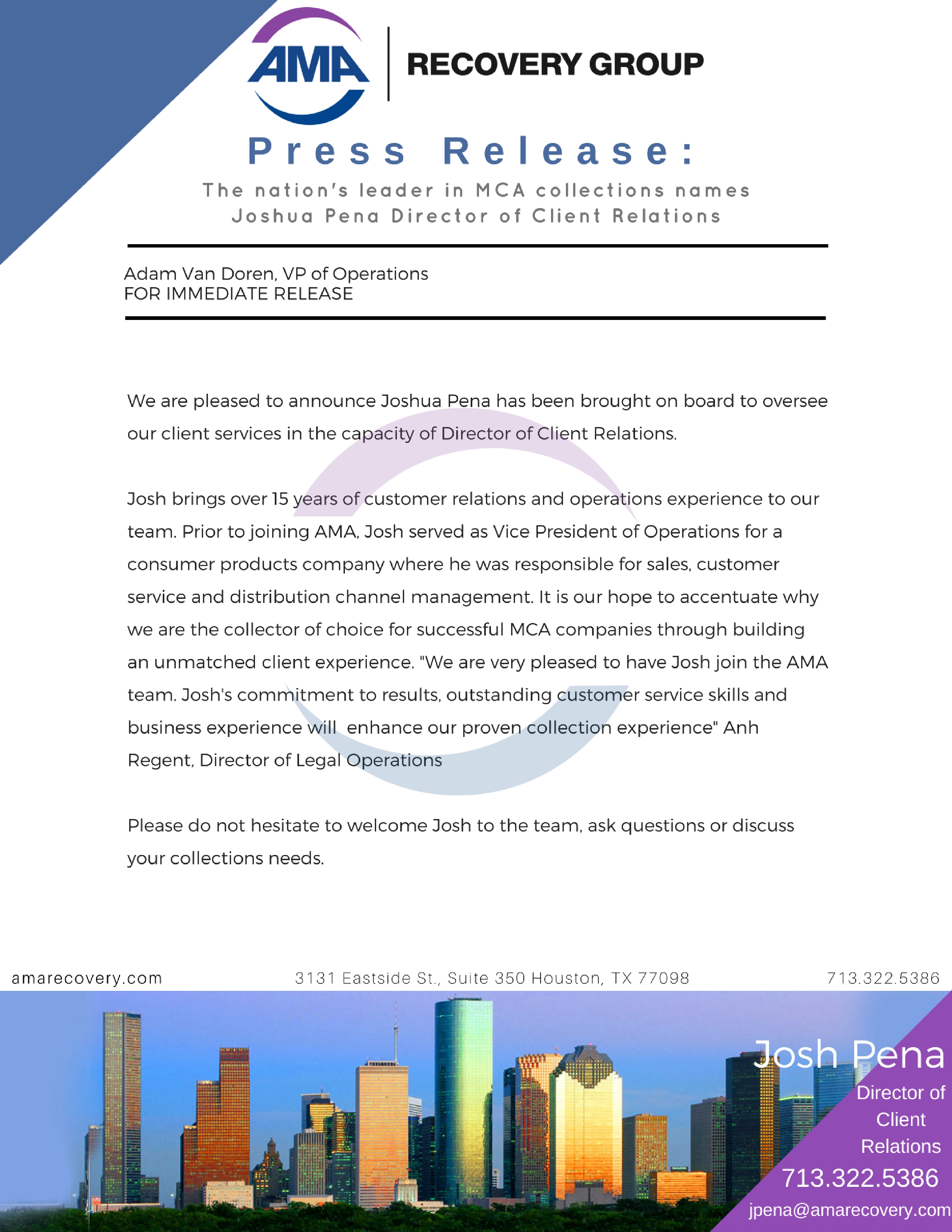 Josh brings over 15 years of customer relations and operations experience to our team. Prior to joining AMA, Josh served as Vice President of Operations for a consumer products company where he was responsible for sales, customer service and distribution channel management. Josh’s hire builds on our unmatched client experience, further accentuating why AMA Recovery is the collector of choice for successful MCA companies. “We are very pleased to have Josh join the AMA team. Josh’s commitment to results, outstanding customer service skills and business experience will enhance our proven collection experience” said Anh Regent, Director of Legal Operations.