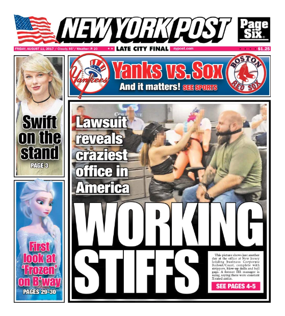 Several defendants are already best known for running an office “so sexually aggressive, morally repulsive, and unlawfully hostile that it is rivaled only by the businesses portrayed in the films ‘Boiler Room’ and ‘The Wolf of Wall Street,’” according to a salacious story that graced the back cover of the New York Post last month.