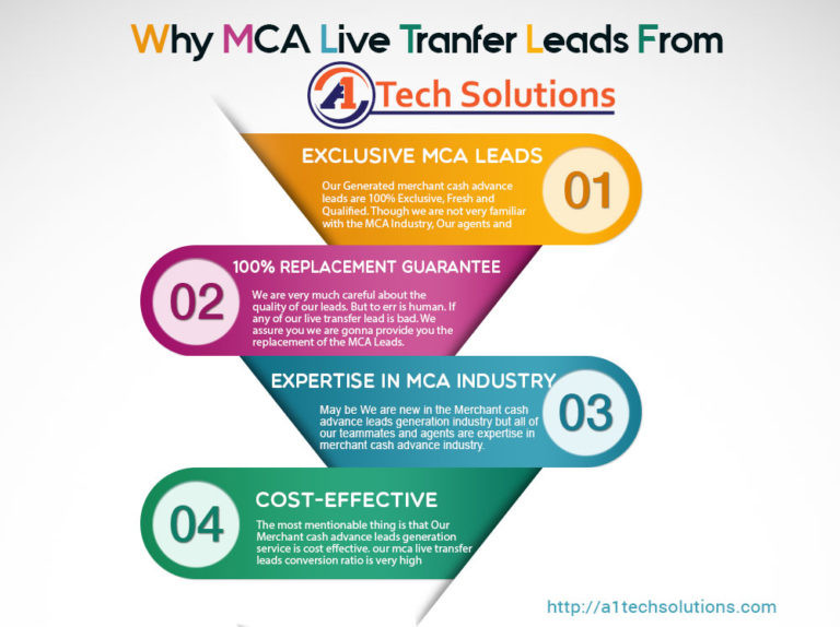 A1 Tech Solutions is a start up merchant cash advance leads Generation Company in the MCA industry. We generate exclusive mca live transfer leads. All of our mca leads are exclusive and qualified. We generate qualified leads. All of our leads are