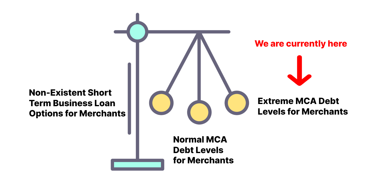In the diagram above, you can see that the pendulum has gone way too far to the right when it comes to Merchant Cash Advance debt. What started off as a benevolent movement designed to help business owners get access to working capital when banks denied them, has somehow turned into a malicious and predatory trend, where now we have merchants out there with extreme levels of Merchant Cash Advance positions. Even when I was running ads to get leads from the freshest lead sources, we were running into merchants who were stacked to the ears with MCA debt...