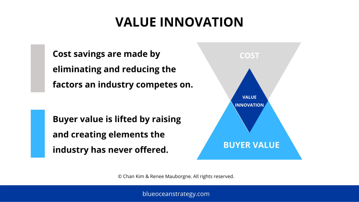 So basically, value innovation is where you're creating more value for the buyer while simultaneously cutting your costs for delivering the value. And of course, the value is delivered in a way that runs tangent to the industry standard (no one in the industry expects the value to be delivered in that way).
