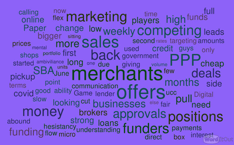 The Word Cloud below describes the state of the MCA industry using our partners’ own words. I find that the overall thoughts are best visualized by taking a step back to see which stand out the most. Our conversation was focused on the industry as a whole, then a discussion specific to Elevate Funding and how we’ve pivoted during these unprecedented times. As you can see, some of the keywords that stand out the most are; merchants, PPP, offers, funders, and marketing.